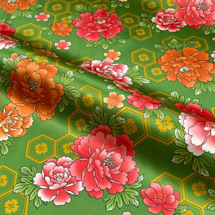 サテンプリント亀甲×牡丹柄 切り売り=1...