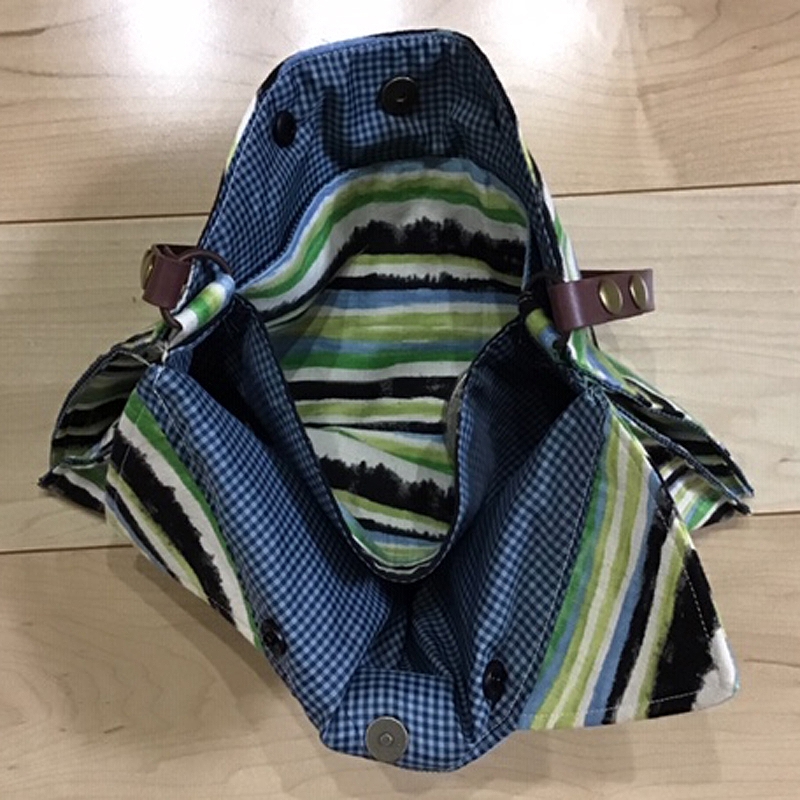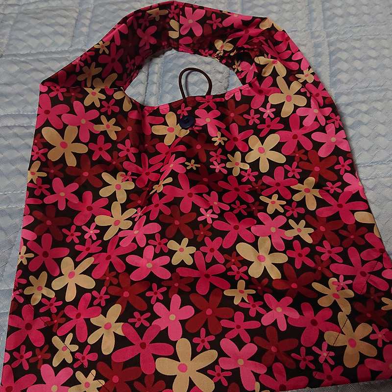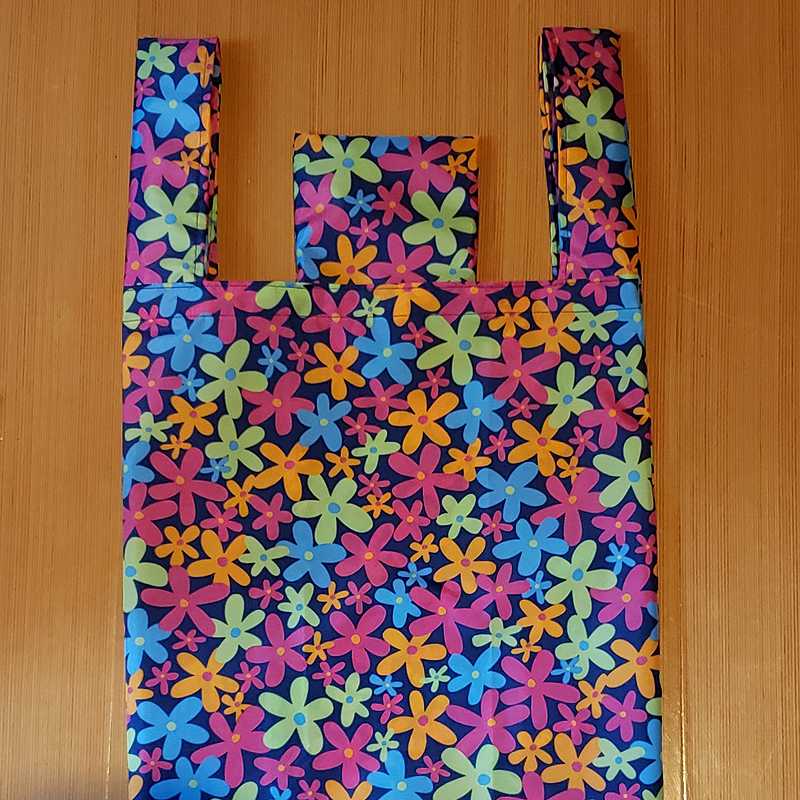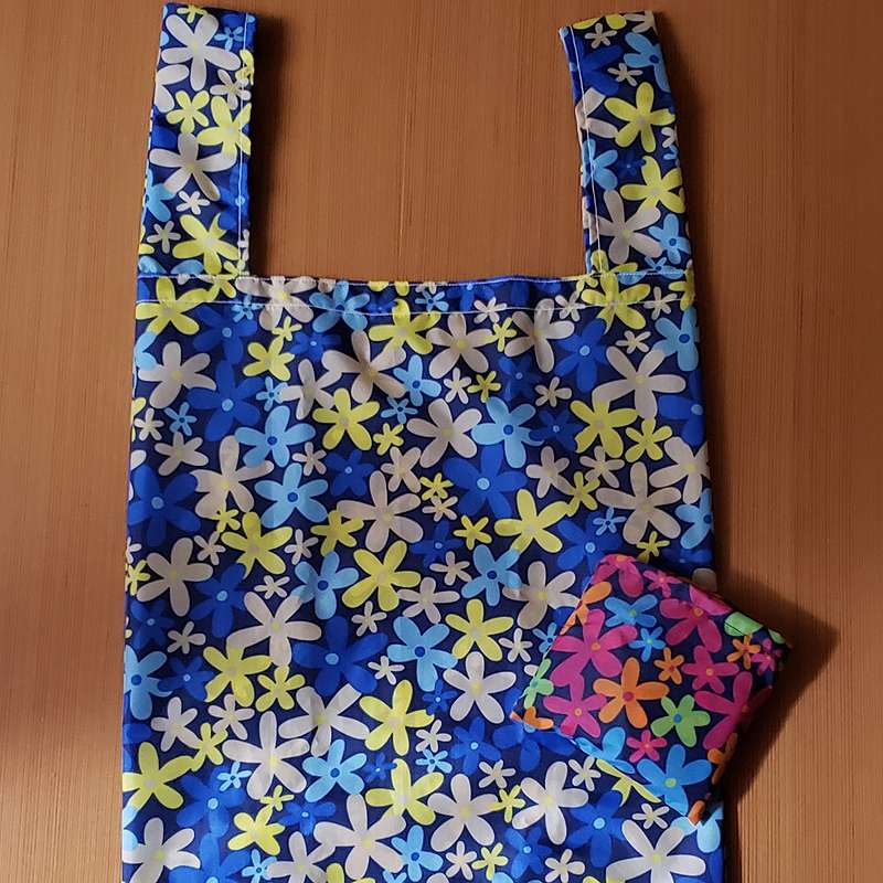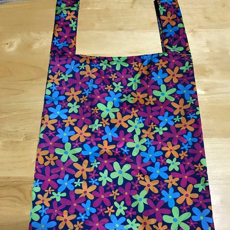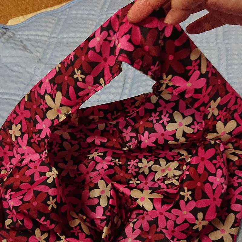 とても素敵な生地なのでどの形のエコバッグにするか悩みましたが、簡単にたためる蛇腹式にしました。ツルツル生地ですが縫いやすく、素人の私でも楽しんで作れました。 |