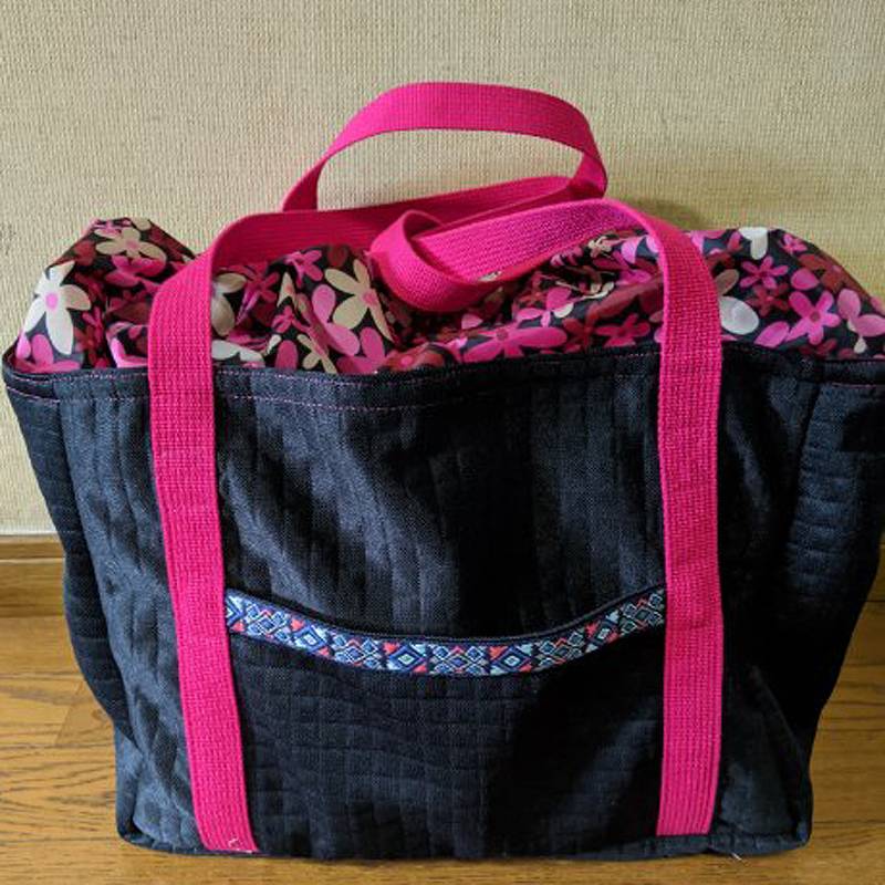 接結キルトニットブラックと、防水タフタマーガレット柄の生地(ネイビー×ブルー)を使って、レジカゴバッグとエコバッグ(画像1)を作り、母親の誕生日にプレゼントしました。 |