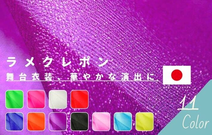 オーガンジーに近い生地感で、一般的にはスパーククレポンと呼ばれています。ラメ糸の様な光沢があるので、弊社ではラメクレポンと呼んでいます。
