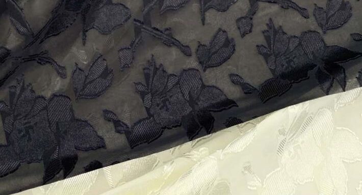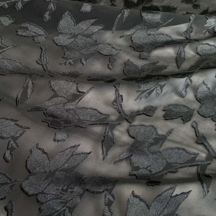 パートごとに異なる表情を見せる薄手のカットジョーゼット生地。シボ感の少ないフラットなシフォンジョーゼットをベースに、ジャガード織りで柄を表現しています。花の輪郭の柄糸を一部カットすることで、細かい毛羽感と立体感を演出。