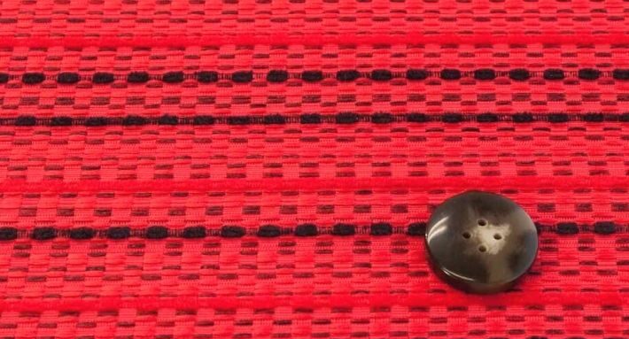 破線状の縞模様が特徴のドビー織りの生地、ストレッチ性はありません。