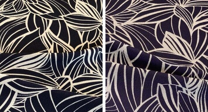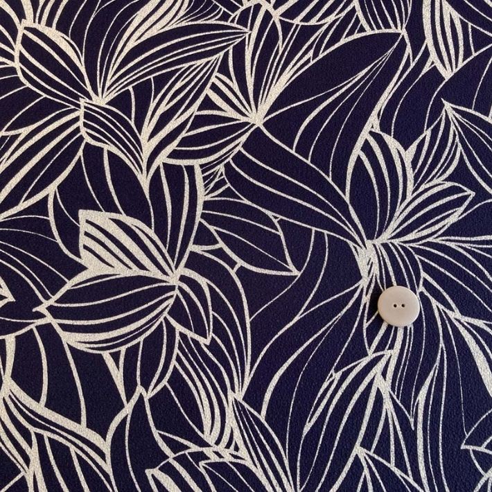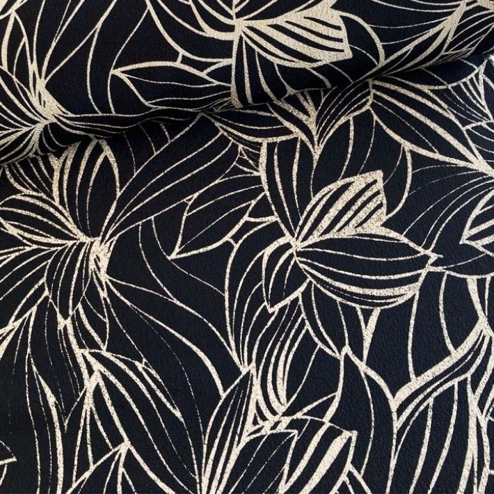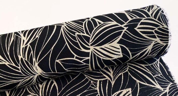 植物の葉のモチーフを集合させた柄がプリントされたちりめん生地。シンプルなモノトーンの配色で、柄のデザインを強調させたモダンな仕上がりになっています。