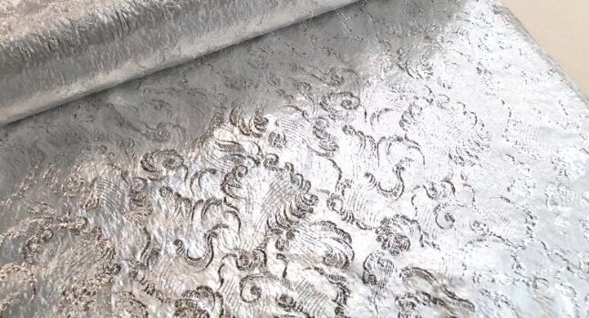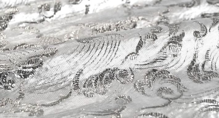 ヨコ糸にポリエステル系のラメ平糸を使っているので、一般的にはラメシャー、メタルシャー、ラメタフタと呼ばれています。