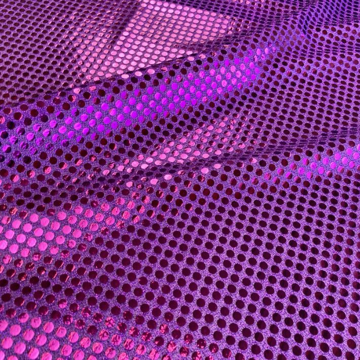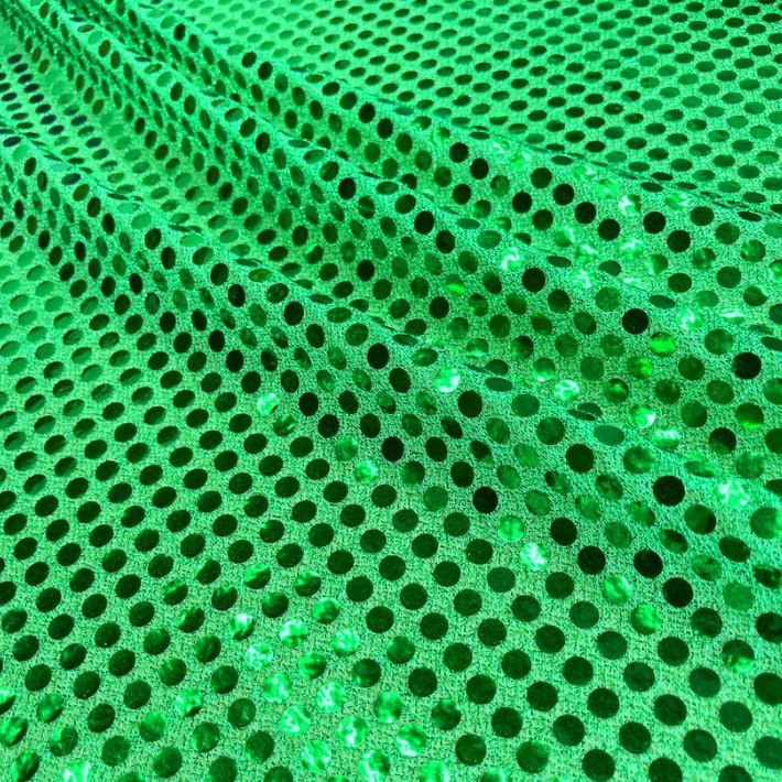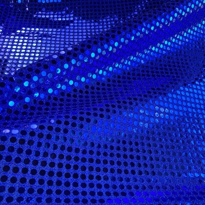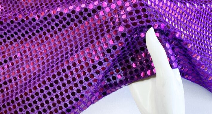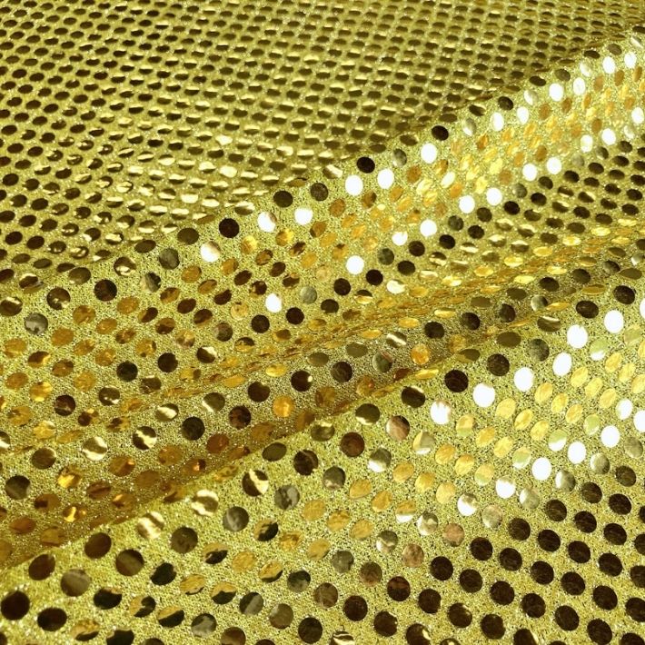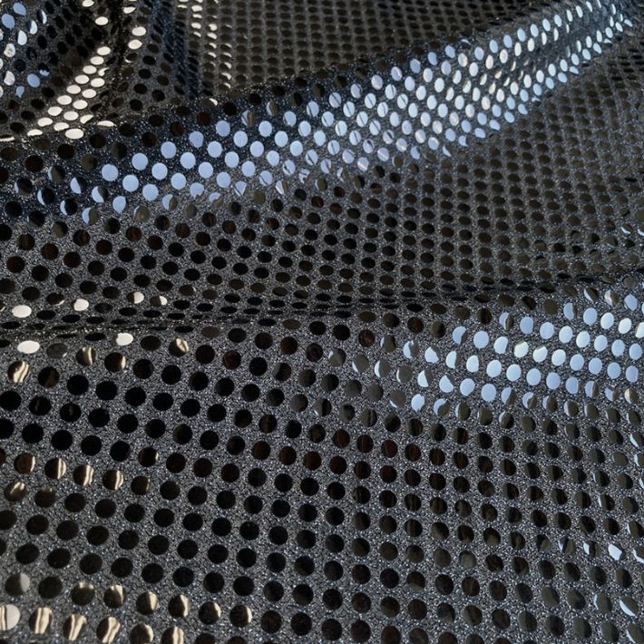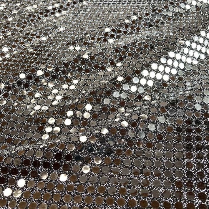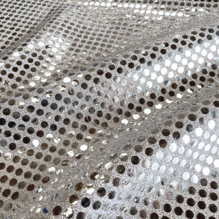 ラメ糸を絡ませた薄手のニット生地の上に、約6mm大のスパンコールを貼り付けています。