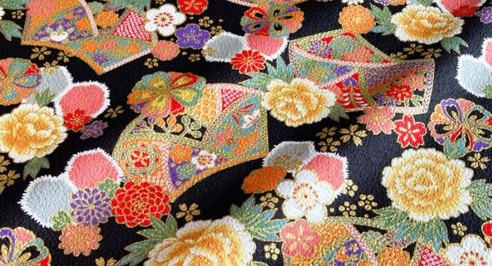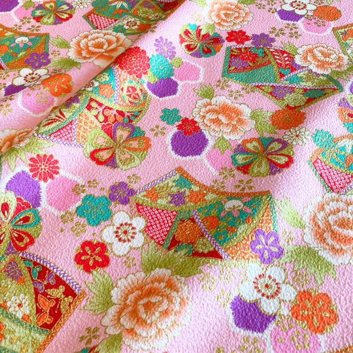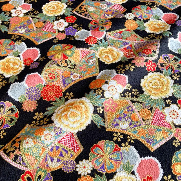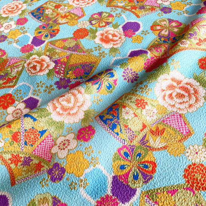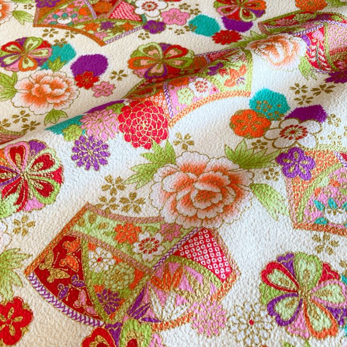 扇面をメインに牡丹・桜・梅・菊・橘などさまざまな植物モチーフを組み合わせた和柄プリント。また扇の中にはさまざまな吉祥文様が落とし込まれていて、とても縁起の良い柄になっています。