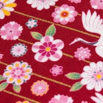 花文様と鶴を金彩プリントで縦につないだ「つるし飾り」のような民芸調のデザインです。(片面のみのプリント)
