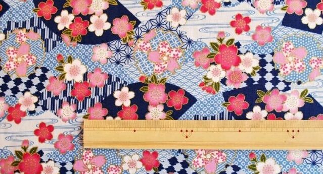 - 綿シーチング金彩プリント218扇文×桜柄 切り売り=1m単位