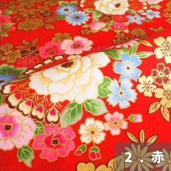 【2.赤】地色は鮮やかな赤、柄はクリーム・紅色・ピンク・水色・こげ茶・緑