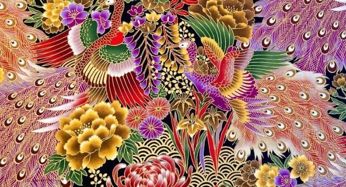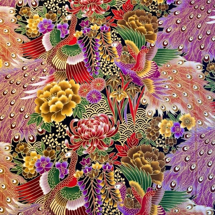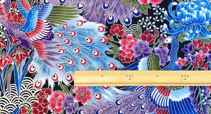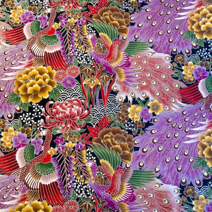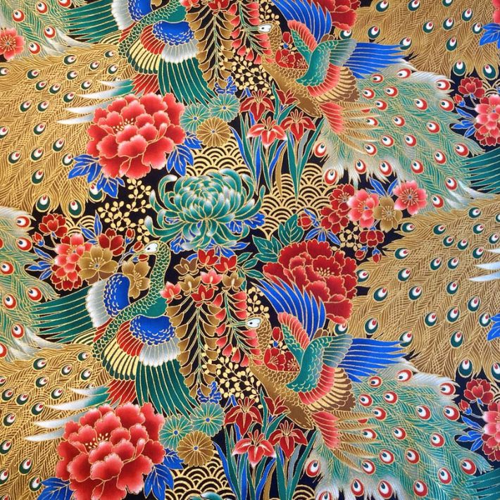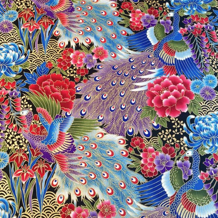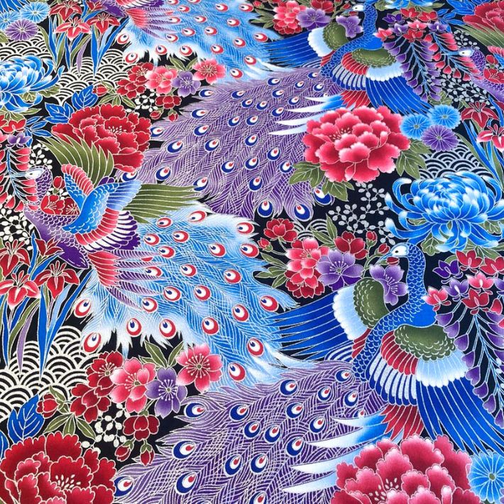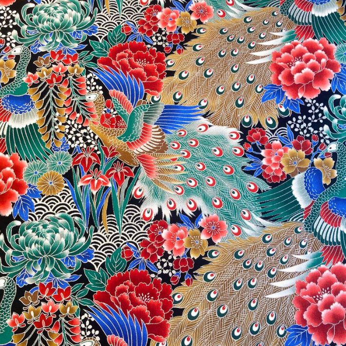 半円形を四重にかさねて波のように反復した「青海波(せいがいは)」に孔雀と花を組み合わせた和柄プリント。