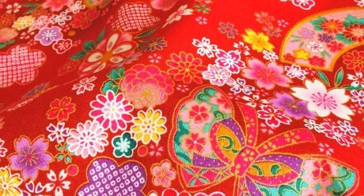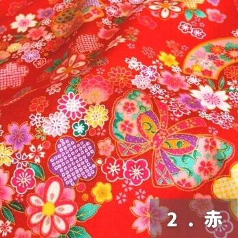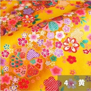 - ※花柄(桜・菊・梅)と古典柄(毬・蝶結び・地紙・花輪)の取り合わせ。柄の一部に金彩