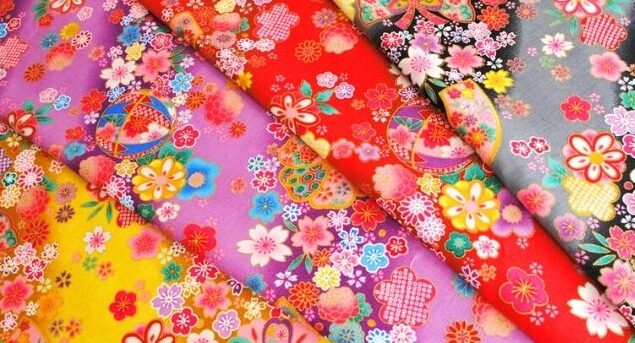 種類の異なる小〜中柄程度の花柄と縁起の良い古典柄を斜めのボーダーになるよう並べています。