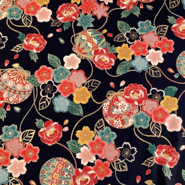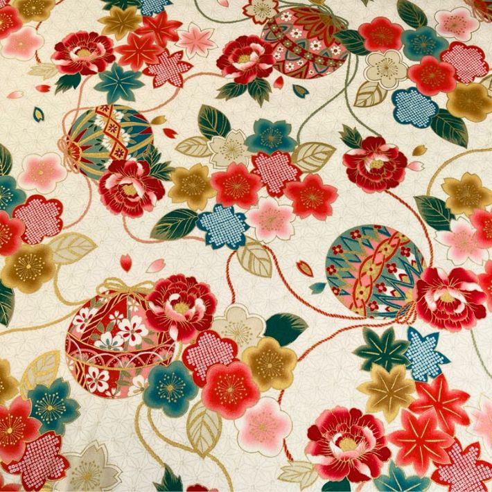 円満や良縁を意味する「手毬」と「百花の王」と称される牡丹をはじめとした季節の花々を配置した和柄プリント。