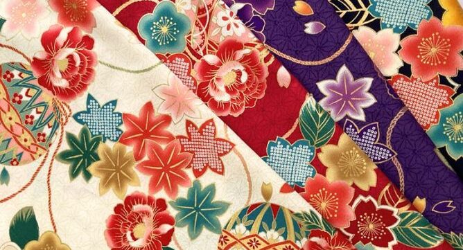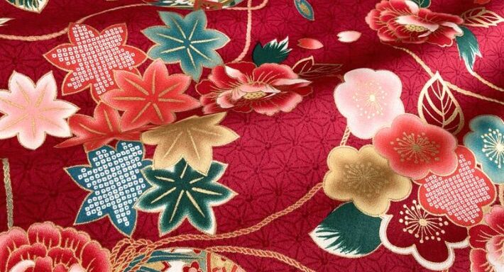 - ※麻の葉の地柄に、毬と花(牡丹・桜・梅・紅葉)の取り合わせ。柄の一部に金彩