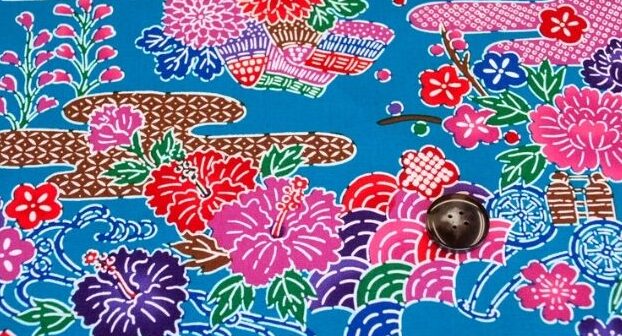 紅型は花鳥風月をモチーフに、中国の文様や日本の小紋柄を大胆な配色で組み合わせたもので、大陸と和の文化がクロスオーバーした柄になっています。