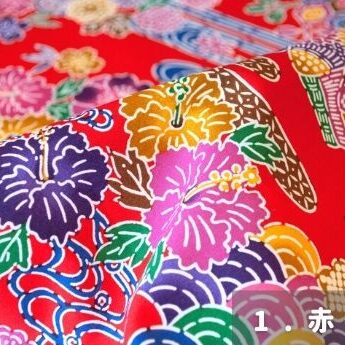 - 【1.赤】地色は鮮やかな赤。柄色は青・緑・紫・ピンク・赤紫・茶色・からし色