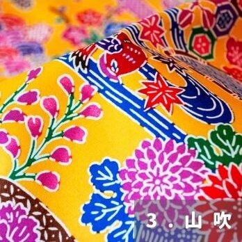 【3.山吹】地色は赤みの黄色。柄色は赤・青・緑・紫・ピンク・茶色・赤紫