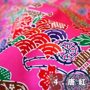 【4.唐紅(からくれない)】地色は濃い紅赤。柄色は青・緑・紫・ピンク・茶色・オレンジ・濃紺