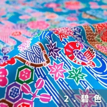 【2.碧色(へきしょく)】地色は緑に近い青。柄色は赤・青・緑・紫・ピンク・赤紫・茶色