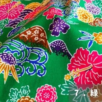 【7.緑】地色は明るい緑。柄色は青・緑・紫・ピンク・赤紫・茶色・からし色
