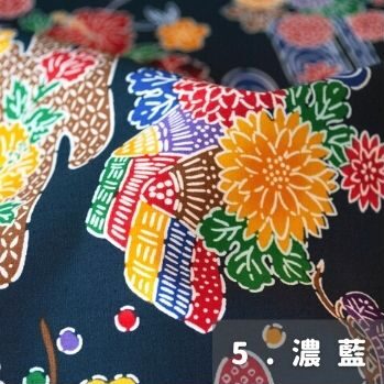 【5.濃藍(こいあい)】地色は黒に近い濃紺。柄色は青・緑・紫・ピンク・茶色・オレンジ・黄色