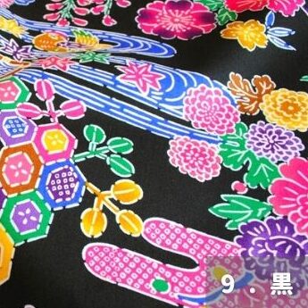 【9.黒】地色は黒。柄色は青・緑・紺・ピンク・赤紫・茶色・からし色