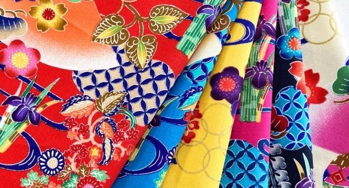 【1.赤】地色は鮮やかな赤。柄色は紺・緑・紫・桃色・橙色・茜色・赤紫・黄土色・利休茶