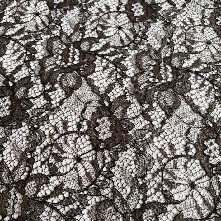 編みと柄の形成を一度に行うので、刺繍レースに比べて平坦で柄の凹凸が少ないのが特徴です。