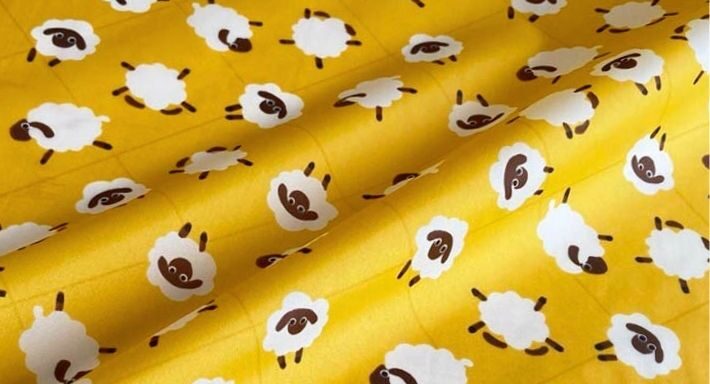 ななめの細格子とモコモコのヒツジ柄がプリントされています。