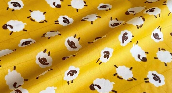 ななめの細格子とモコモコのヒツジ柄がプリントされています。