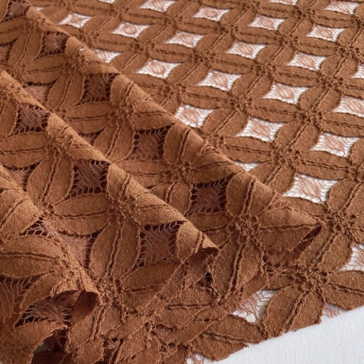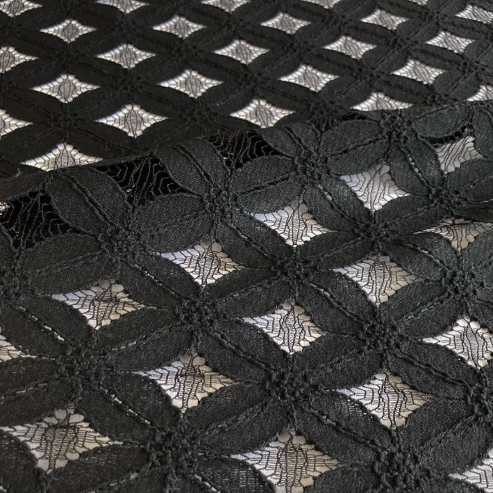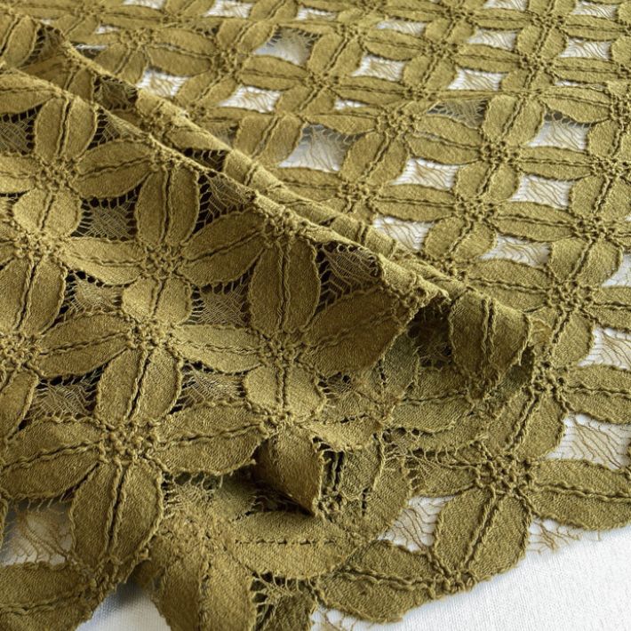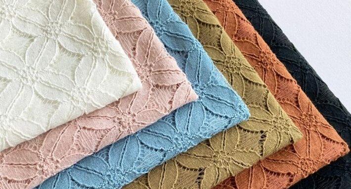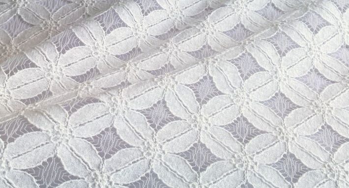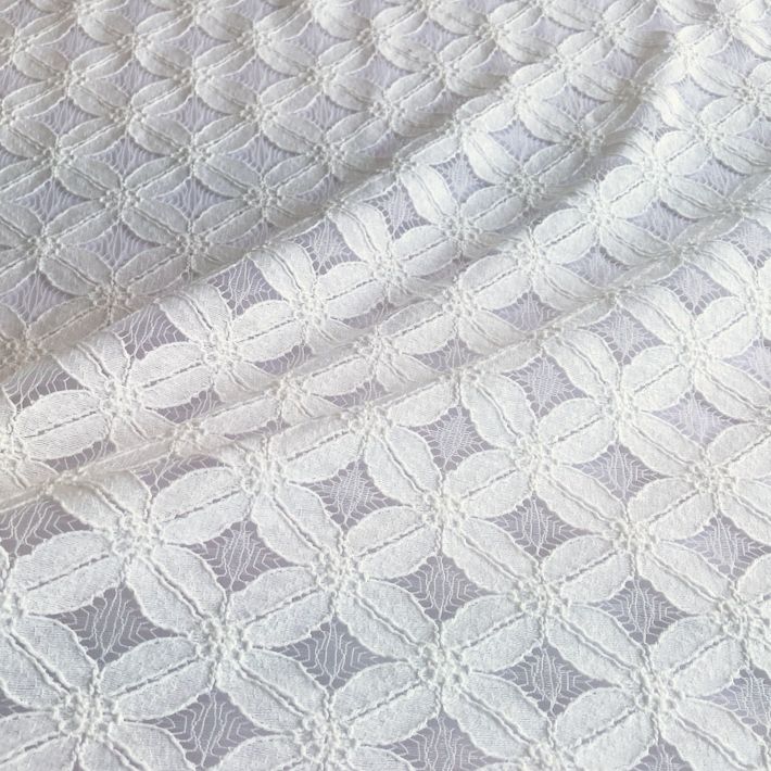 ナイロン糸のベースに太番手のコットンコード糸で凹凸感のある柄を演出。丈夫で繊細なナイロンと、コットンのやわらかい風合いとナチュラル感が生きたラッセルレースです。 ラッセルレースは「ラッセルレース編機」と呼ばれる経編機で作られたポピュラーなレース。柄を縁取りしたものは「コードレース」と呼ばれ、立体感のある仕上がりになります。