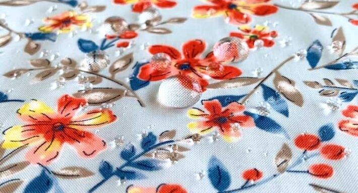 織り目の隙間を塞ぐアクリルコーティングと併用することで一定の防水性はありますが、長時間の雨や水に浸けた場合は水分が内側に浸透します。また撥水加工は洗濯や摩擦により次第に効果が薄れていきます。