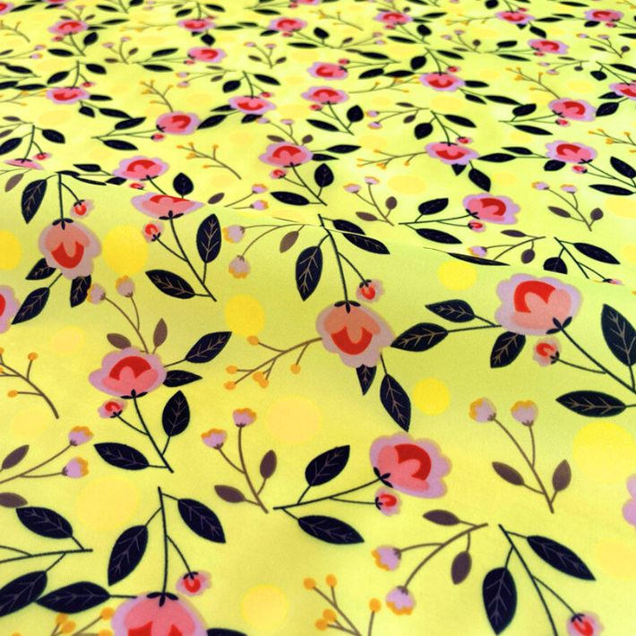 【E.イエロー】明るい黄色地に黄色の水玉、花はピンク/赤/カラシ系