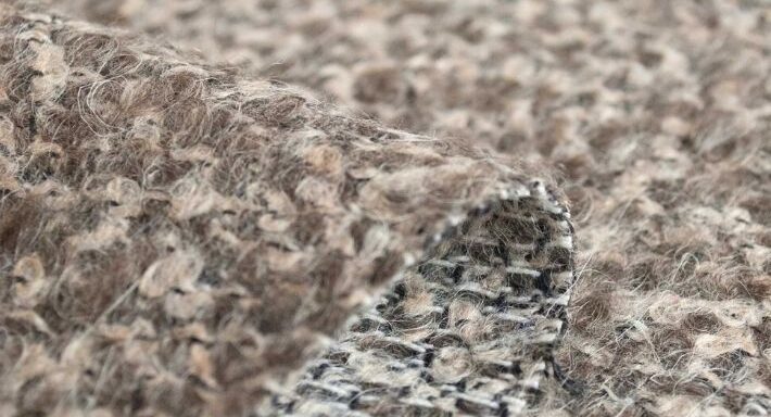 白(タテ糸)と黒(ヨコ糸)のストレートヤーンをベースに、クルっとカールした茶系のループヤーンを絡ませたウォーム感のあるテクスチャー。